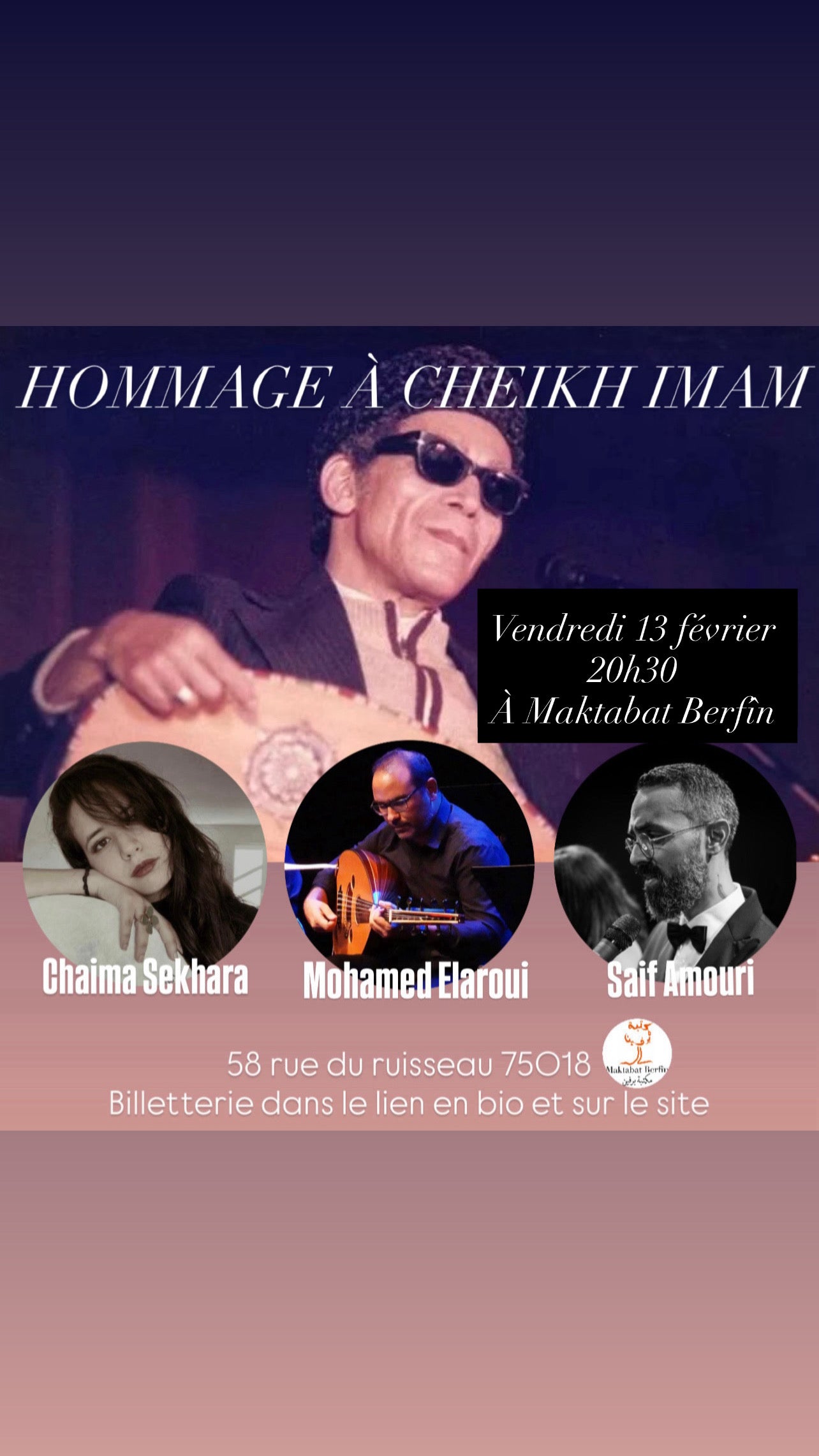 Hommage à Cheikh Imam avec Mohamed Elaroui (oud) Seif Amouri (chant) et Chaima Sekhara (chant, bandir) 20h30 à maktabat Berfin 58 rue du ruisseau 75018