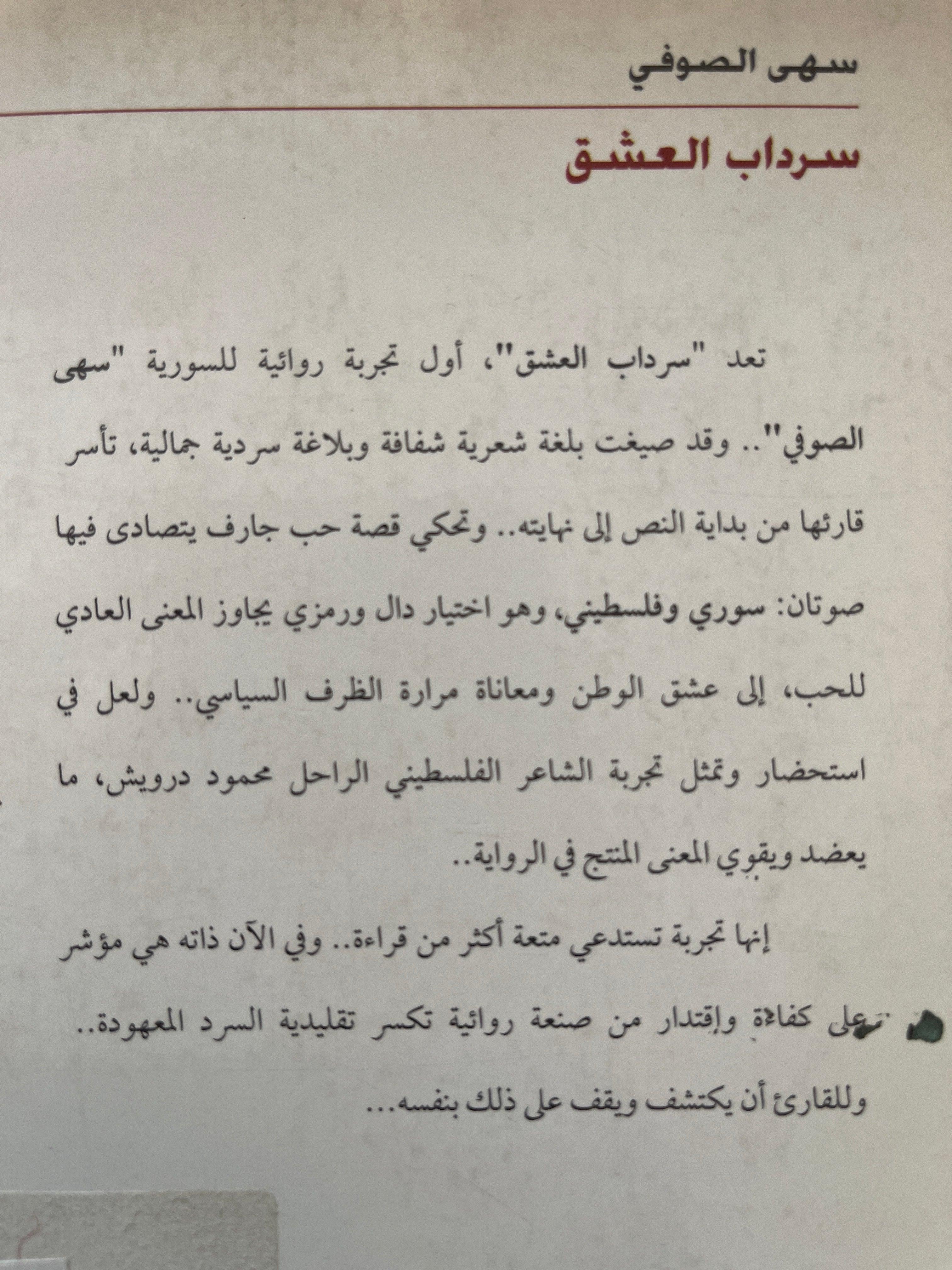في روايتها الأولى «سرداب العشق» تطرح الكاتبة السورية سهى الصوفي قصّة حبّ جارفة بين «صوتين» هما: المرأة السورية والرجل الفلسطيني. معهما يتجاوز الحبّ معناه التقليدي ليطال عشق الوطن والمواطن العربي الذي لا يبرح يغرق في معاناته الناتجة أولاً من الظرف السياسي والأمني في بلاده. وتتميّز الرواية بأسلوبها الشعري ولغتها البليغة التي تحوّل النصّ السردي أحياناً إلى قصيدة شفافة.